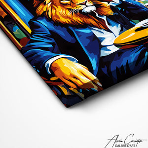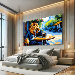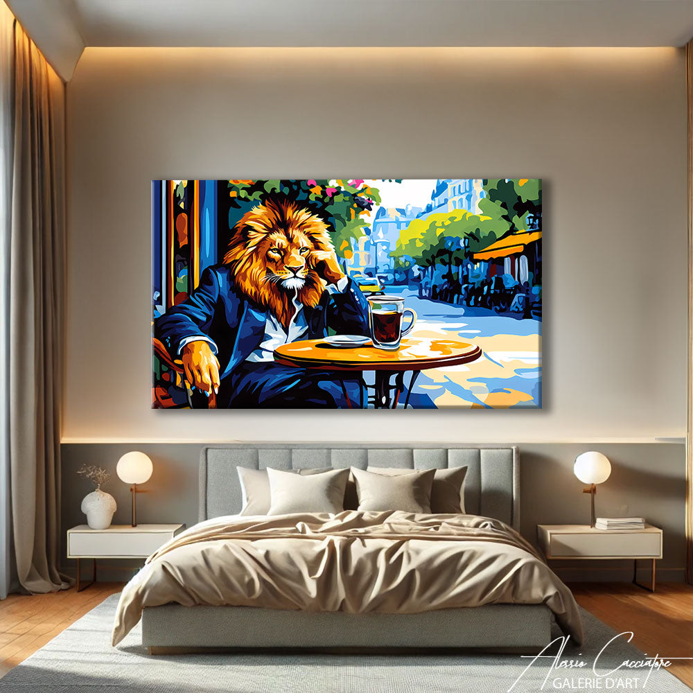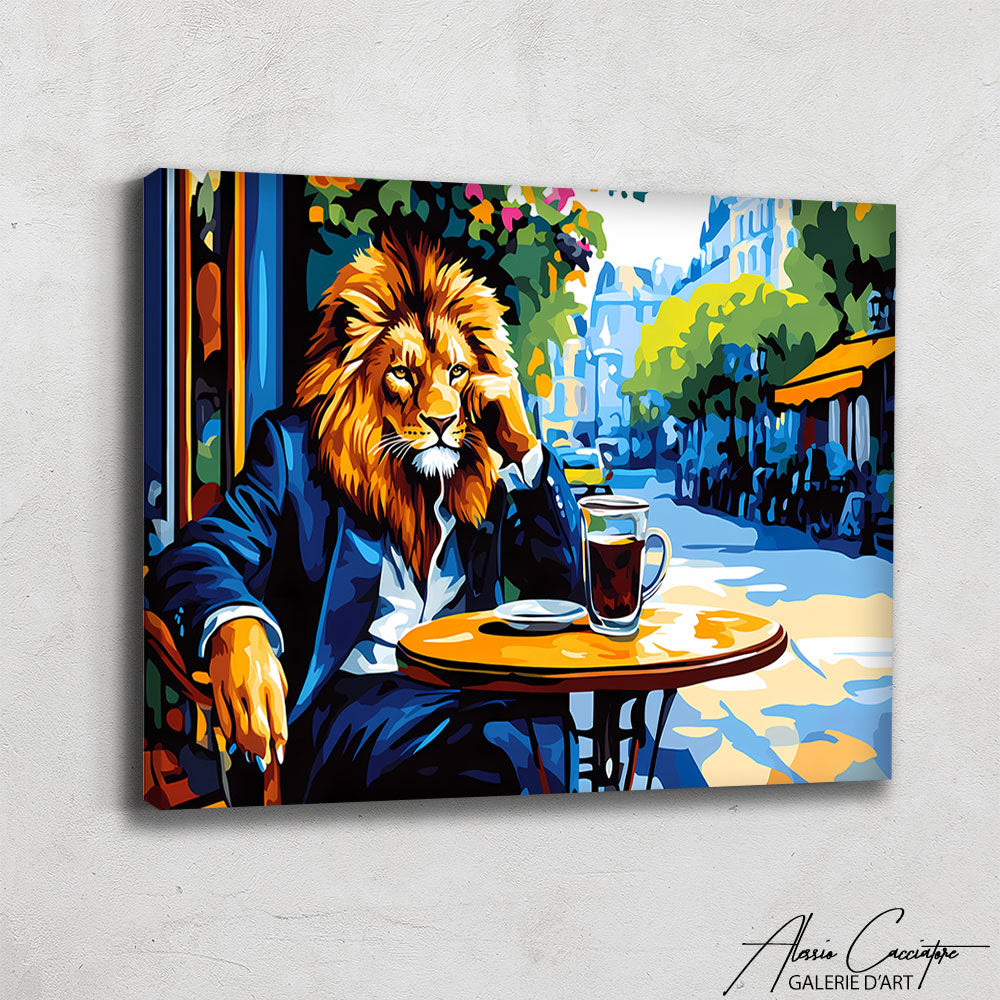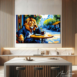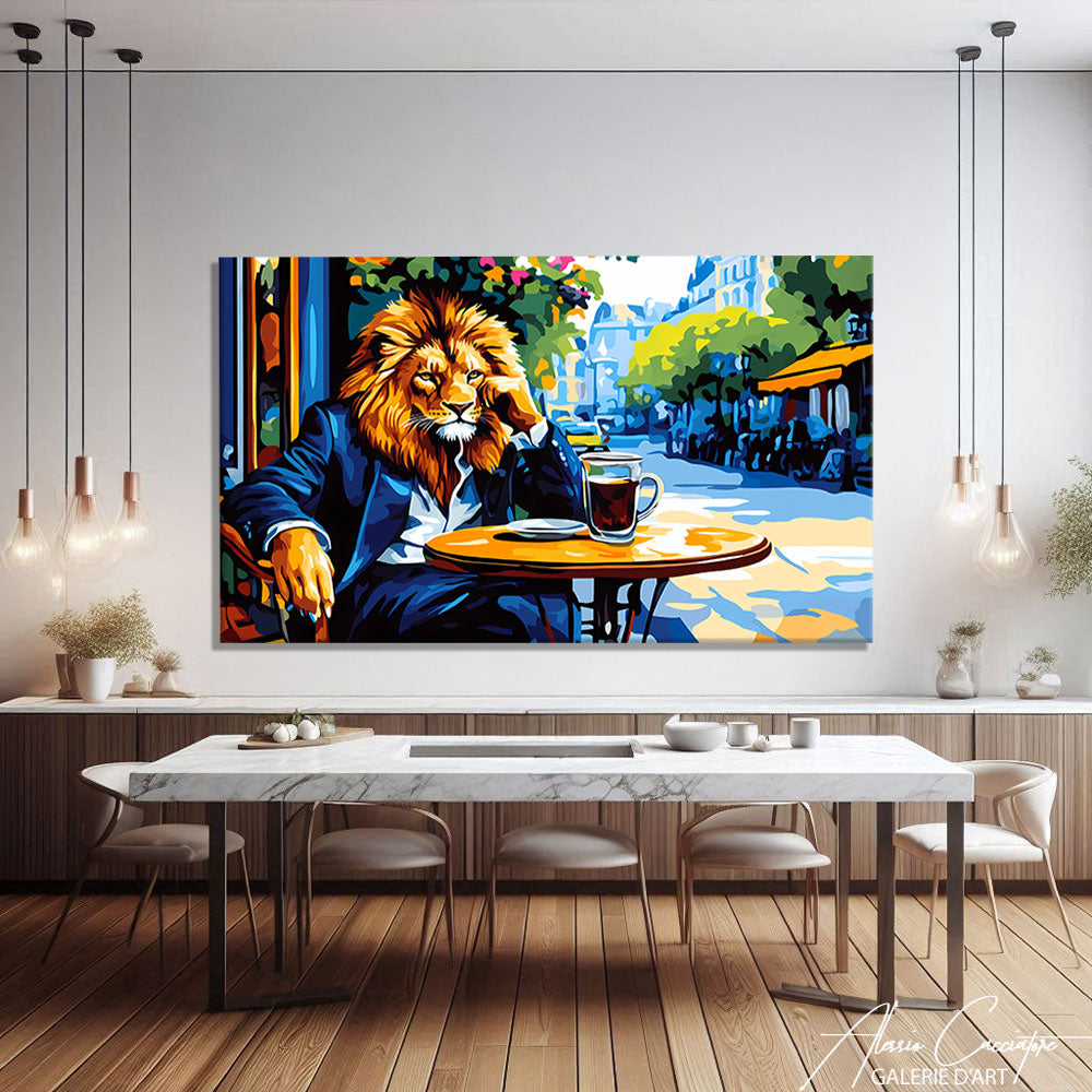 Notre tableau lion présente un portrait en costume assis au café chic et moderne, cette œuvre décorative dégage élégance et audace.