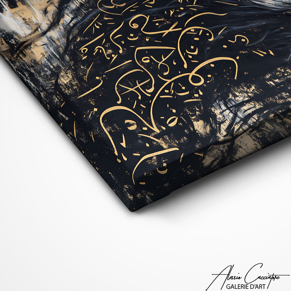 Notre tableau design animaux règne avec majesté, ce lion doré sur calligraphies arabes fond noir. Puissance royale et art oriental fusionnent dans cette œuvre noble qui transforme votre salon en palais moderne aux influences culturelles raffinées.