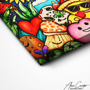 Notre tableau propose un univers artistique ludique rempli de formes, fleurs et personnages stylisés. Les couleurs vives et les détails graphiques créent une ambiance joyeuse et originale. L’ensemble apporte une touche moderne et créative à votre intérieur. Parfait pour dynamiser un espace avec une note artistique unique.