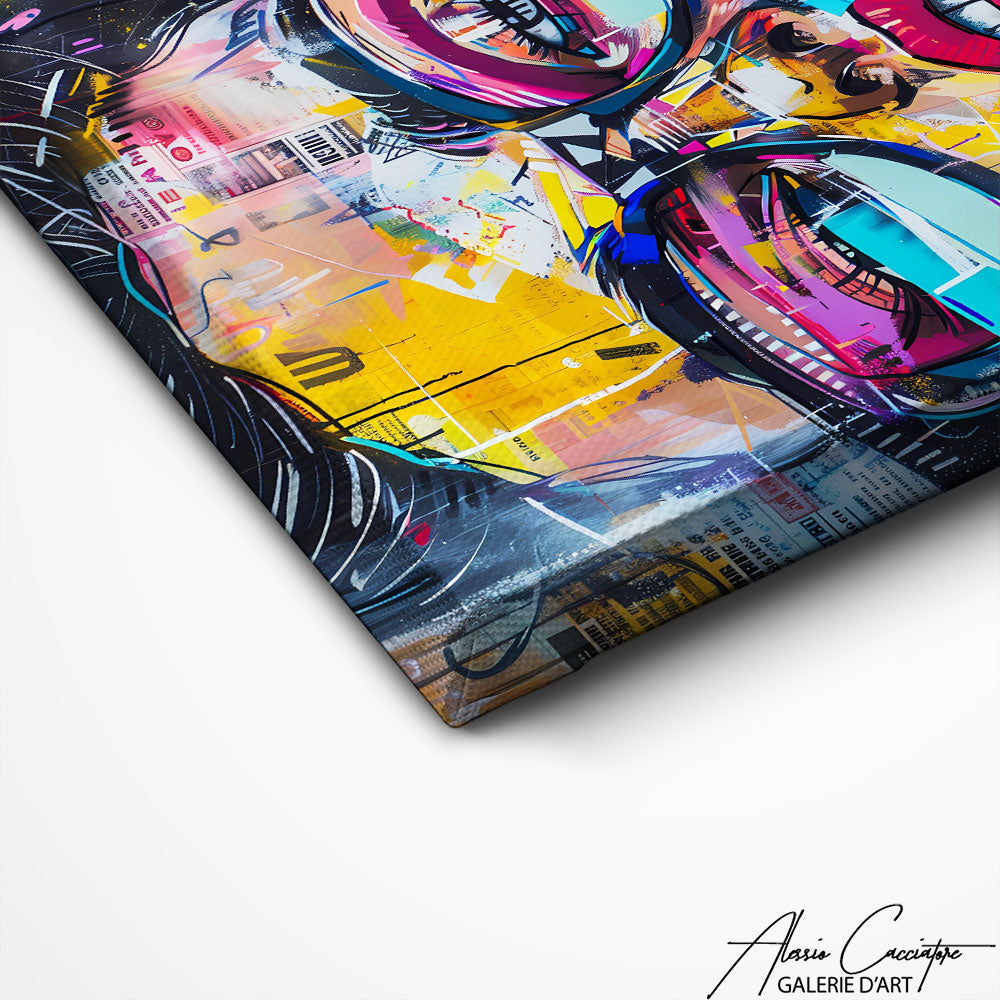 Ce tableau portrait d'une femme dans un style street art capture l'énergie brute et l'expressivité du street art, transposant la force et la résilience féminines sur des toiles urbaines, vibrantes de vie et de couleur.