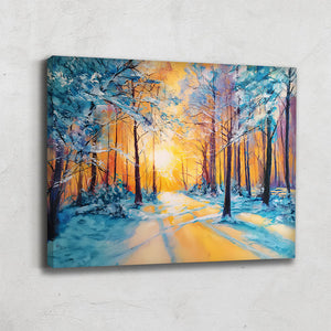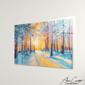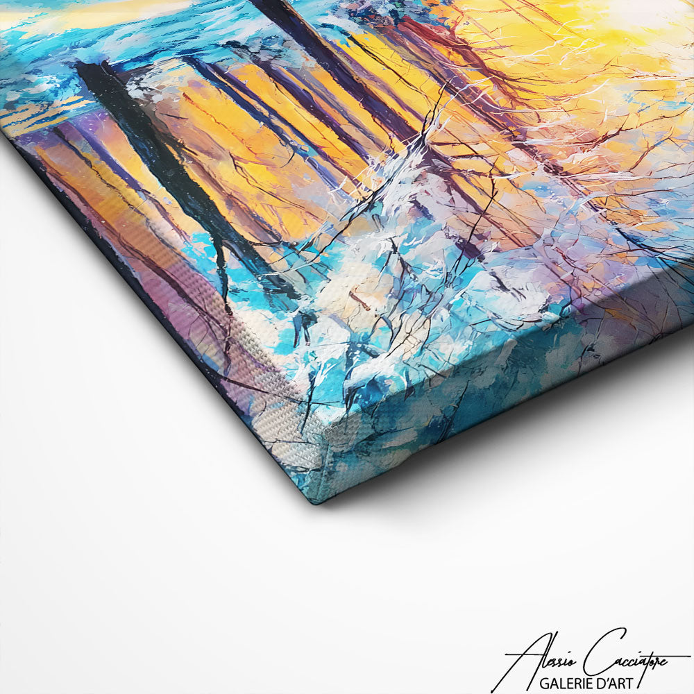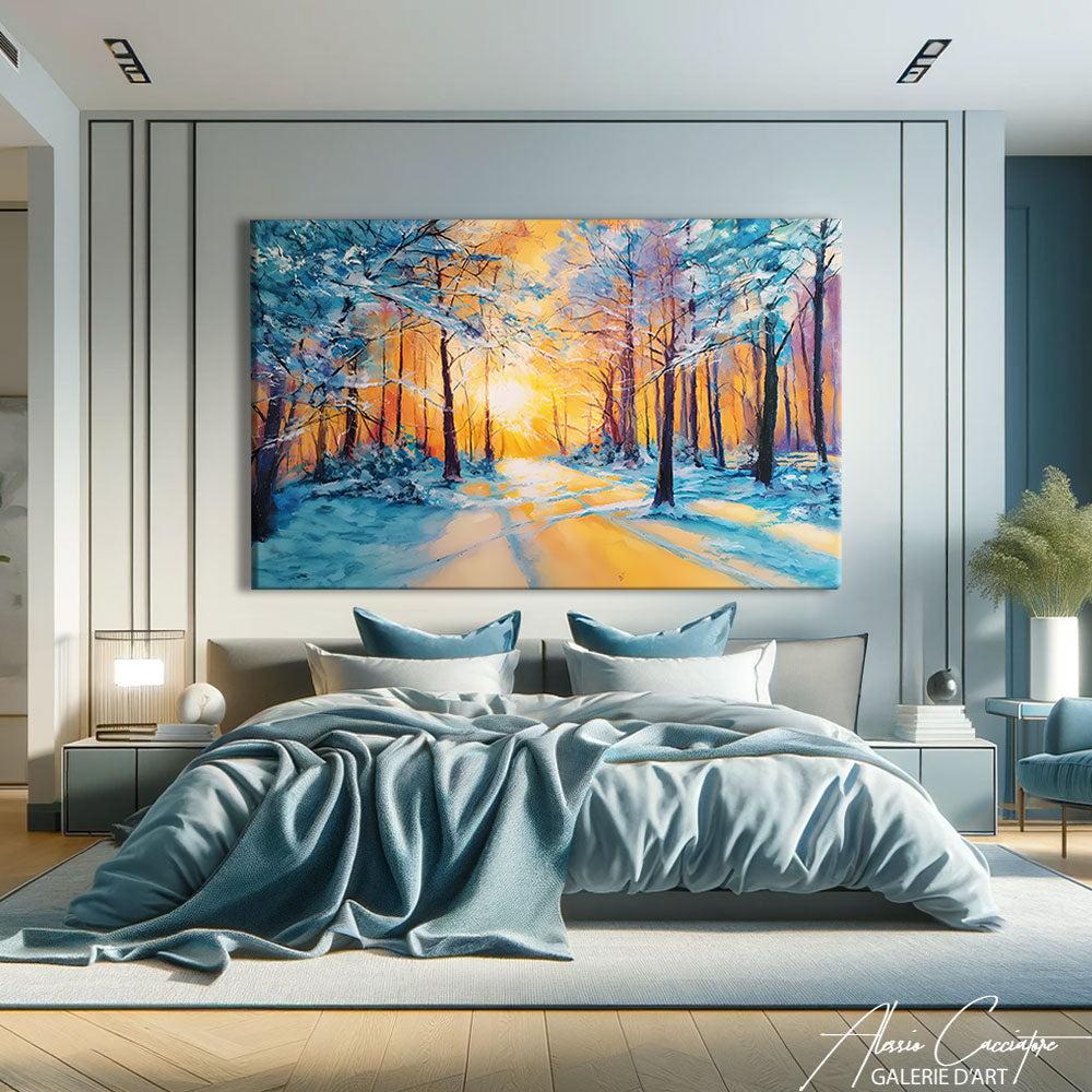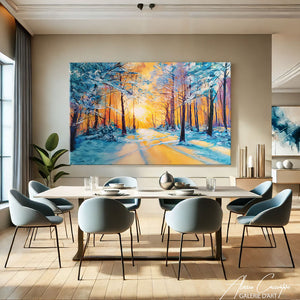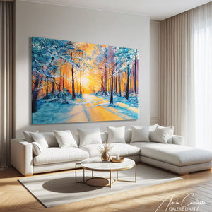 Notre tableau forêt enneigée présente un paysage blanc doré sous un ciel chaud. Élégante et lumineuse, elle évoque la beauté silencieuse de l’hiver. Une pièce idéale pour une déco moderne et raffinée.