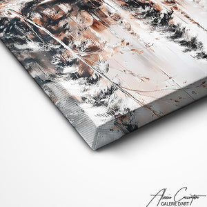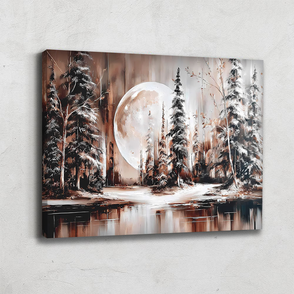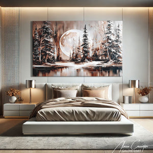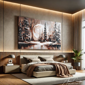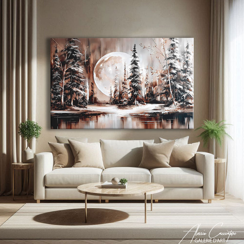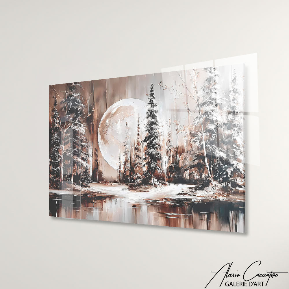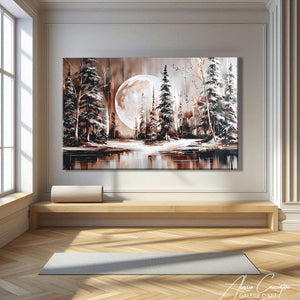 Notre tableau forêt hiver représente une forêt éclairée par la pleine lune. Envoûtant et poétique, il mêle lumière et profondeur. Idéal pour une ambiance feutrée et raffinée.