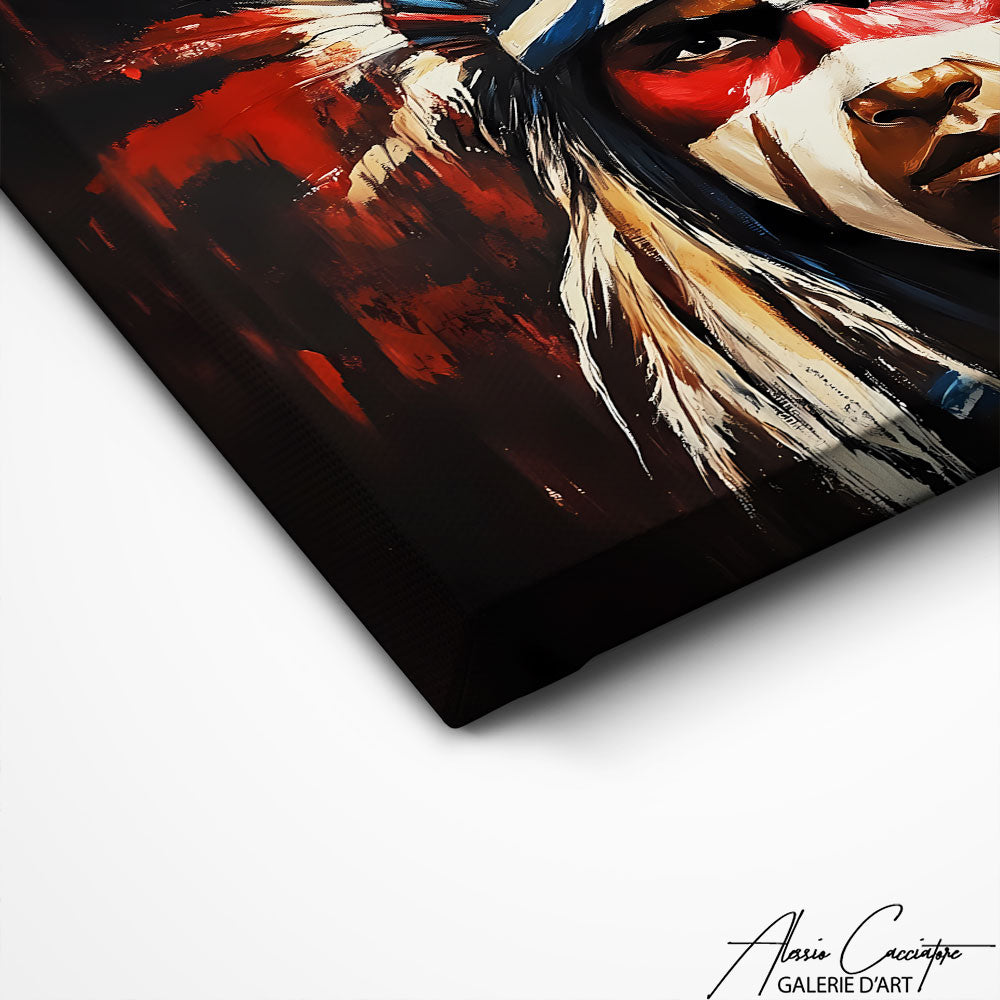 Notre tableau représente un visage indien orné de peintures de guerre, symbole de courage, de force et de connexion avec les esprits de la nature. Chaque nuances et chaque couleur de ce tableau expriment une signification profonde, rendant hommage aux traditions et aux valeurs des peuples amérindiens. Parfait pour un salon ou un bureau, il impose une présence forte et inspirante, créant une ambiance à la fois historique et artistique.