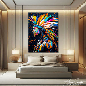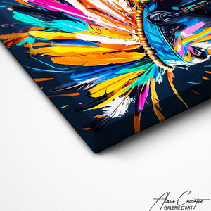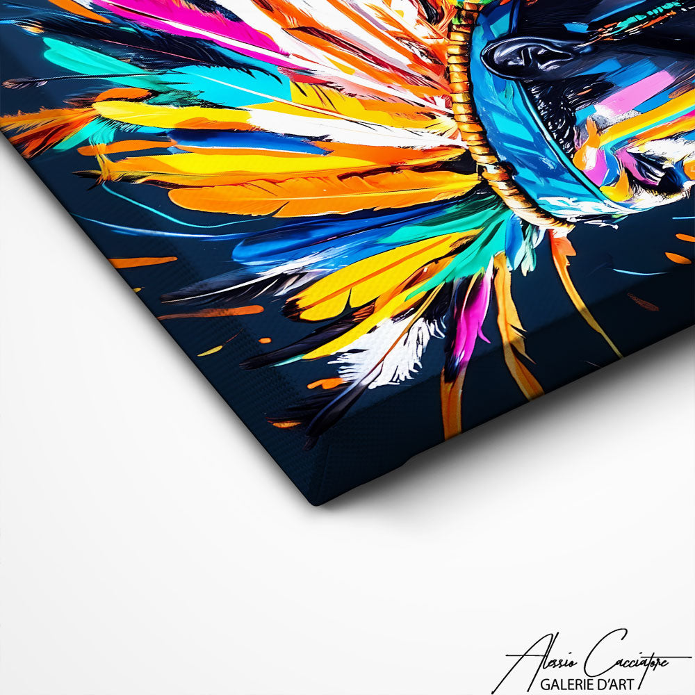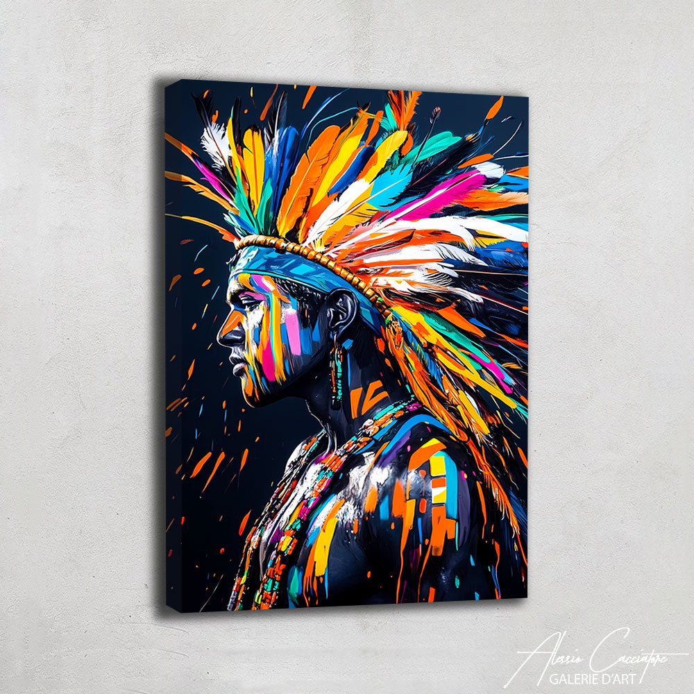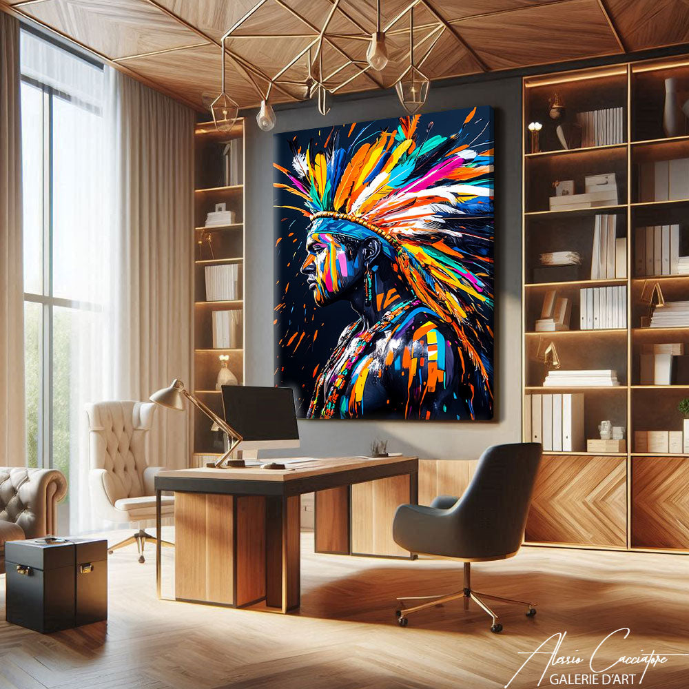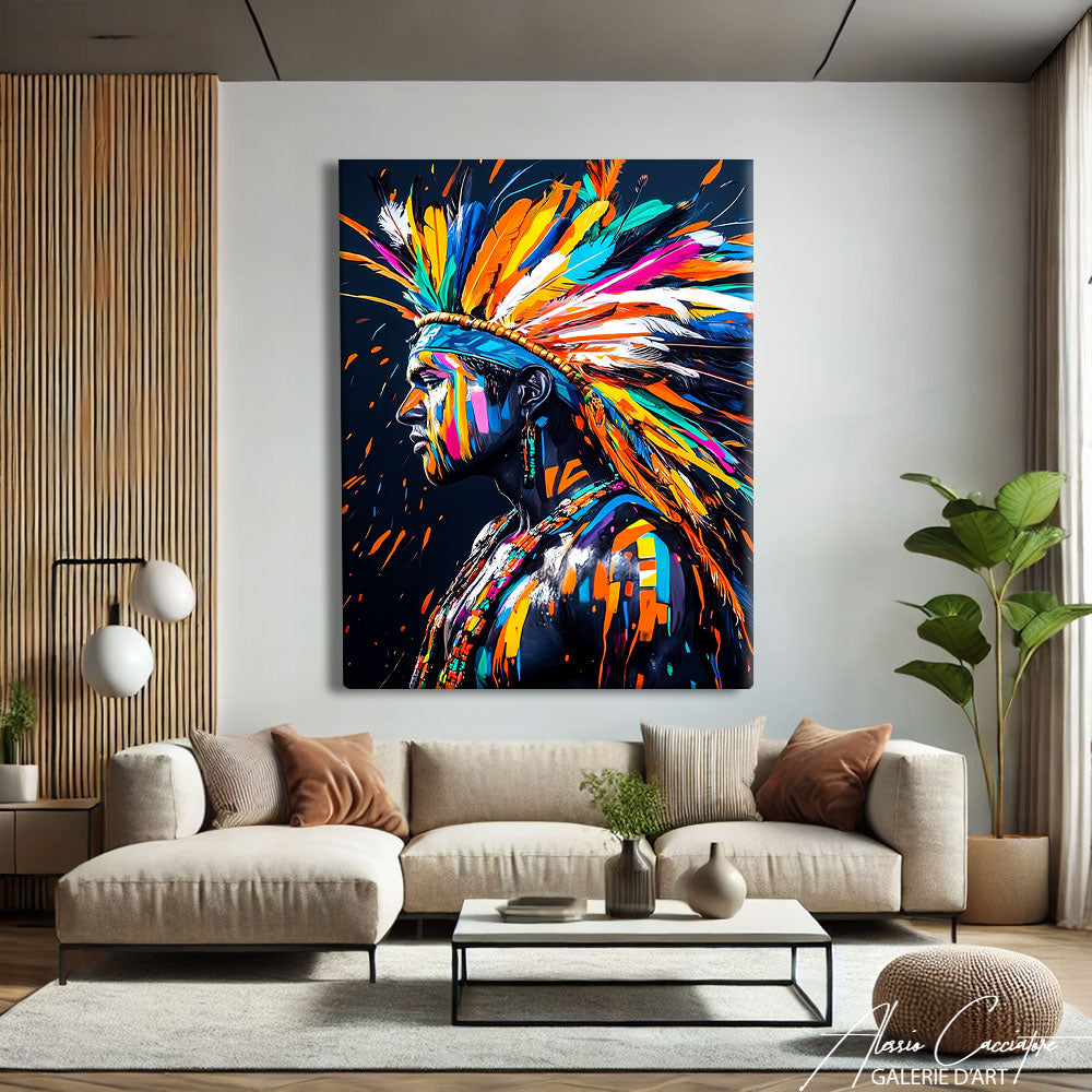 Notre tableau amérindien illustre un chef de profil en pop art avec de grandes plumes colorées. Une création pleine de symboles qui marie culture et modernité. Une pièce forte qui attire immédiatement le regard et donne du caractère à vos murs.