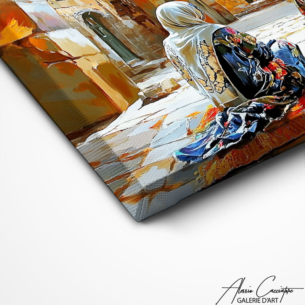 Notre Tableau Prière Islam capture un moment spirituel authentique, mettant en scène deux figures en prière dans un décor traditionnel. Les couleurs chaleureuses et l’atmosphère paisible renforcent toute la profondeur émotionnelle de la scène. Une œuvre idéale pour instaurer une ambiance respectueuse, apaisante et empreinte de spiritualité dans votre intérieur.