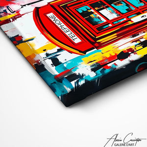 Notre tableau présente une cabine téléphonique rouge occupe le centre de l'oeuvre. Elle se détache sur un fond abstrait composé de couleurs vives et de formes verticales. Les contrastes accentuent la silhouette iconique de la cabine. Notre tableau associe symbole urbain et expression artistique contemporaine.