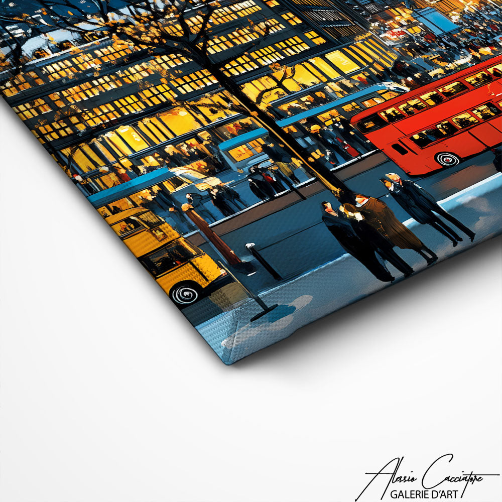 Notre Tableau Londonien capture la vie nocturne londonienne sous la neige, avec ses bus rouges iconiques et ses bâtiments illuminés. Les contrastes entre le bleu profond et les couleurs chaudes créent une dynamique visuelle unique. Une pièce idéale pour donner du rythme à votre décoration.