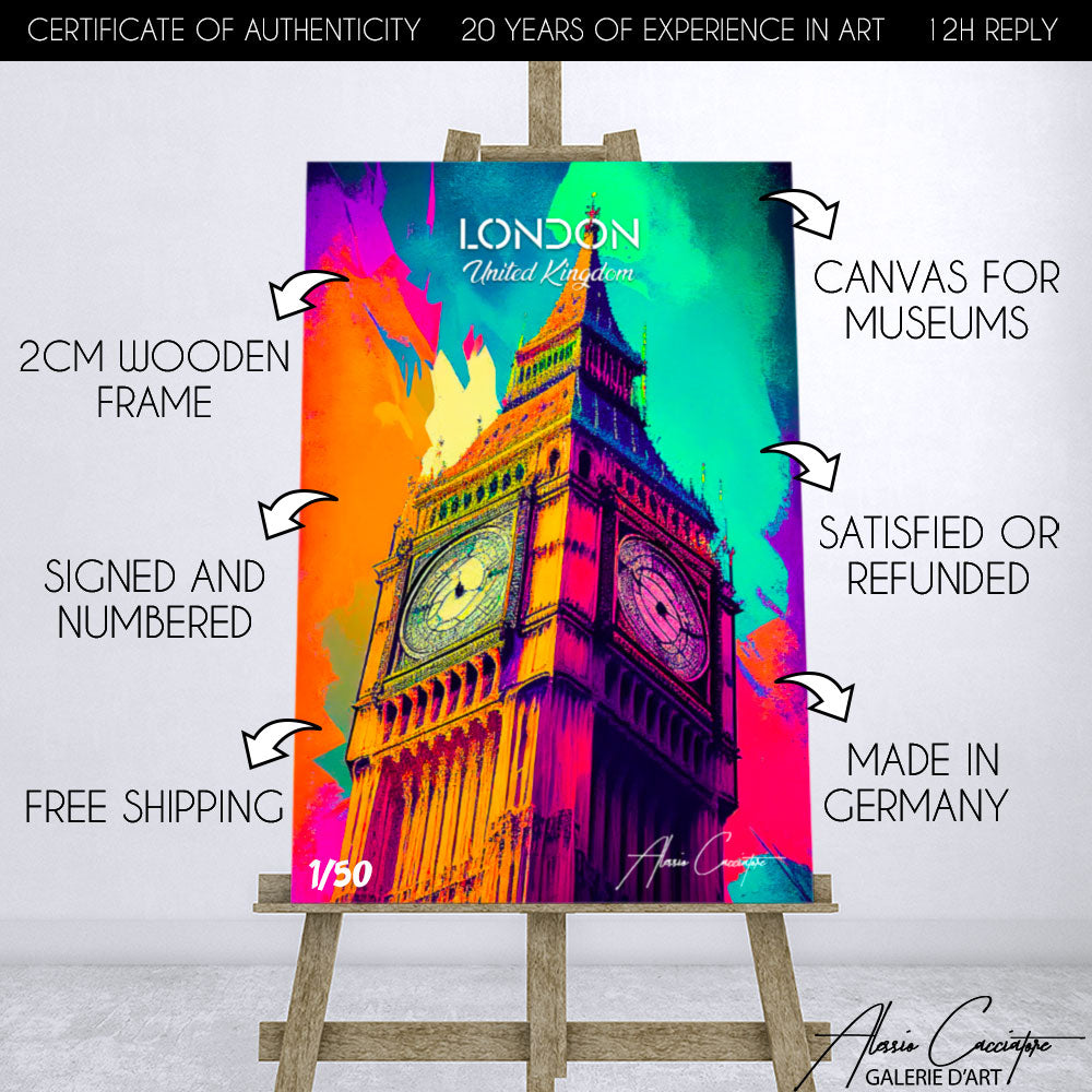 Notre tableau Londres coloré transforme votre décoration avec l'éclat vivant de la capitale britannique. Cette œuvre urbaine sublime un salon cosmopolite ou une entrée en apportant dynamisme et élégance british. La ville mythique fascine par ses monuments iconiques rehaussés de couleurs éclatantes. Idéal pour créer une ambiance londonienne sophistiquée qui évoque le charme et la modernité anglaise.