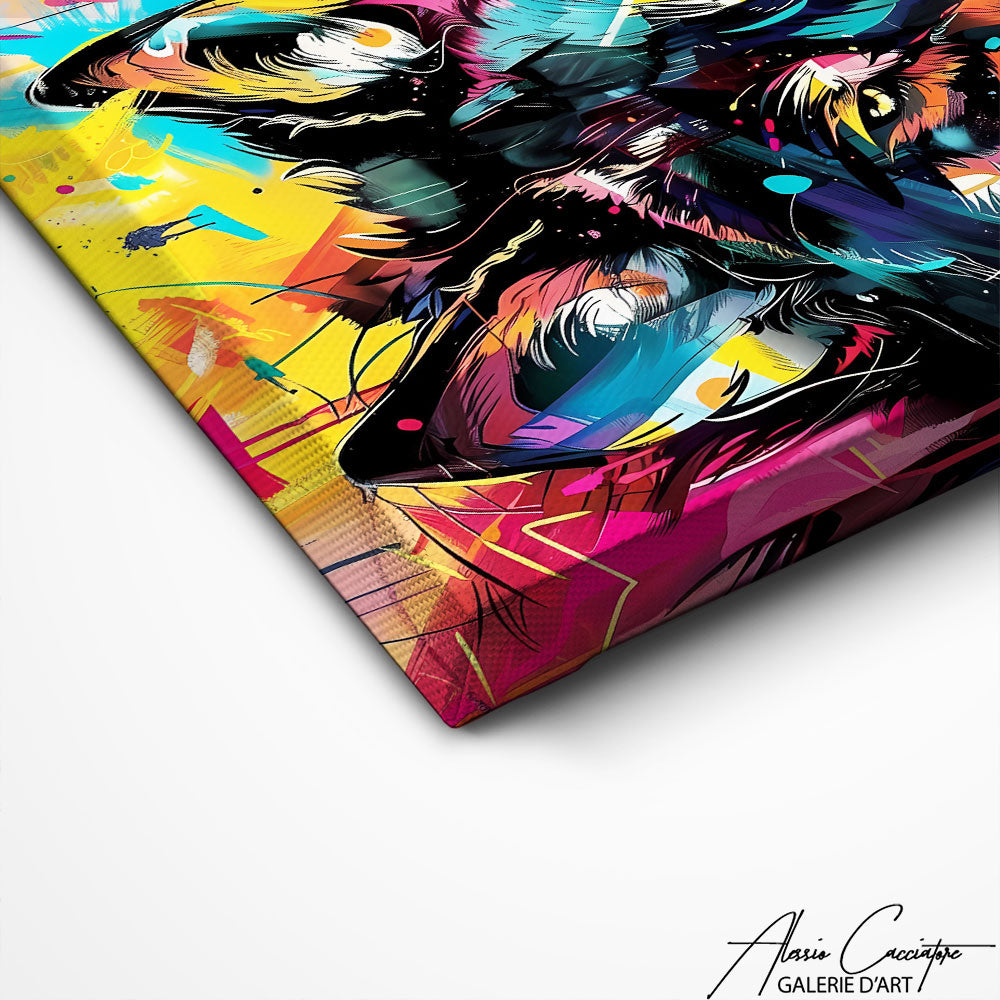 Ce tableau loup coloré au style contemporain revisite l'image traditionnelle du loup en lui donnant une dimension audacieuse. Les couleurs vives et apportent une touche d'originalité à votre décoration.