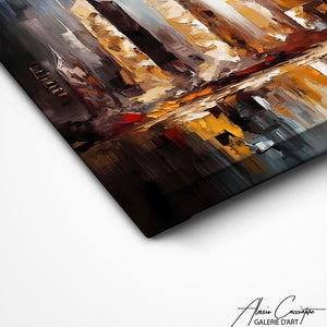 Notre tableau toile decoration New York illustre la skyline de la ville dans un style abstrait, où les gratte-ciel emblématiques se fondent dans des formes dynamiques et des couleurs audacieuses. L’ensemble reflète l’énergie unique de la ville. Parfait pour une déco urbaine et contemporaine. Ce tableau donne à New York une dimension artistique vibrante.