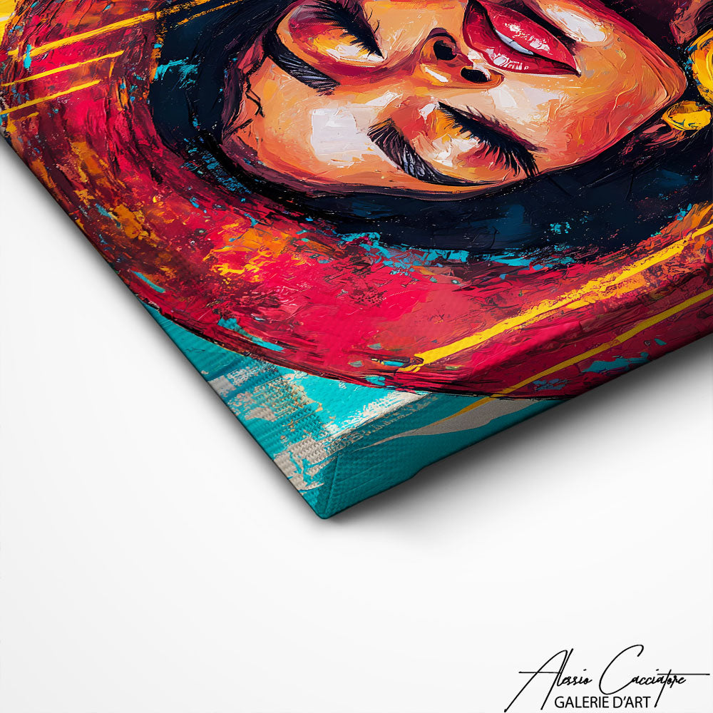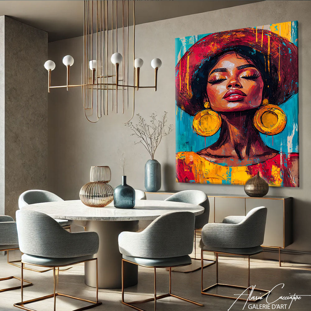 Mettez en valeur la beauté de la culture africaine avec notre tableau femme africaine, où le portrait est entourée de motifs et de couleurs harmonieuses. Idéal pour ajouter une touche d'exotisme et de sophistication à votre décoration