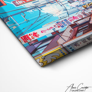 Ce tableau des rues Tokyo met en lumière une rue calme et paisible, typique d'un quartier japonais. Les enseignes colorées bordent une allée peu fréquentée, où quelques passants déambulent tranquillement. Parfaite pour un décor urbain, elle capture l'essence de la culture japonaise.