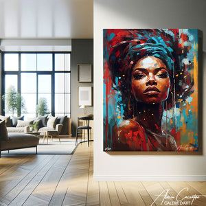 Le portrait de la femme capturée sur la toile parle d'élégance, de force et de fierté. En choisissant ce tableau, vous rendez hommage à l'incroyable diversité et richesse de la féminité africaine.