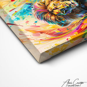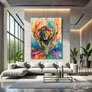 Ce tableau lion multicolore combine des nuances vibrantes pour offrir une représentation audacieuse et pleine de vie du lion. Parfait pour égayer un espace, il capte l'attention et apporte une touche de dynamisme à votre décor.