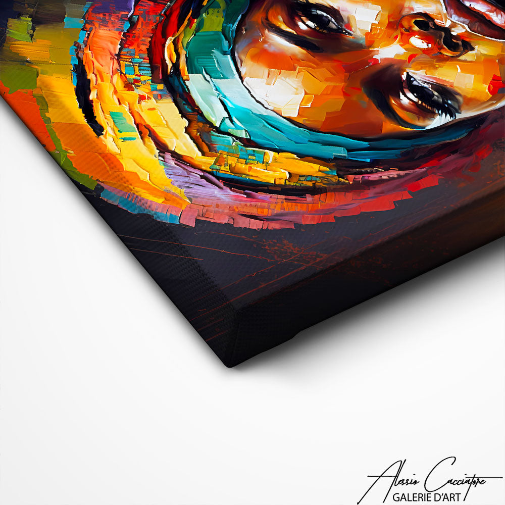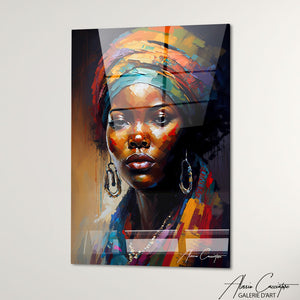 Notre tableau style africain met en scène une femme africaine au regard affirmé, coiffée d’un turban richement coloré et stylisé. Les motifs évoquent les traditions et l’élégance du style africain avec une touche contemporaine. Parfait pour une déco chaleureuse et culturelle. Ce tableau célèbre la beauté, la fierté et l'identité africaine.