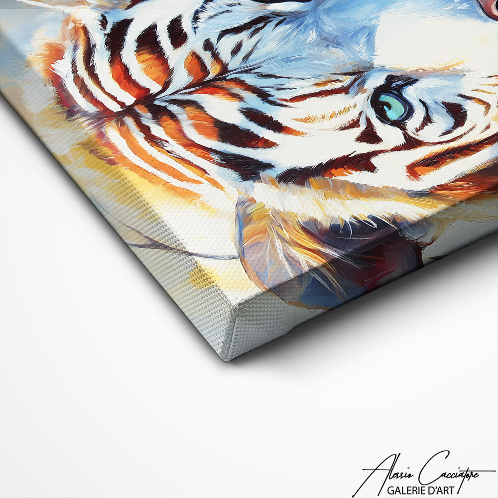 Ce tableau tigre blanc aux yeux bleus capture la majesté et la mystique de cet animal rare. Les contrastes saisissants entre le blanc du pelage et l’intensité des yeux bleus en font une œuvre captivante, idéale pour créer un point focal puissant dans n'importe quel espace.
