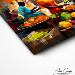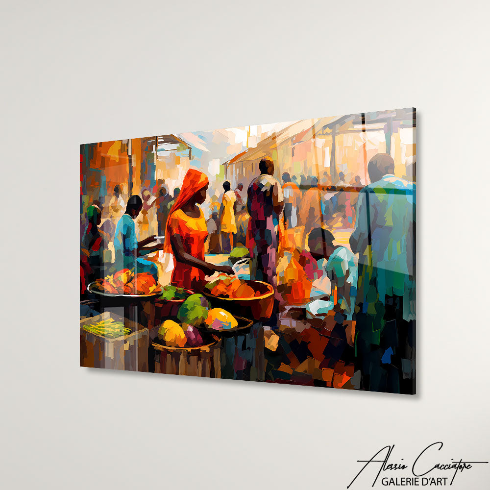 Notre tableau marché africain représente une scène animée de marché africain, avec ses silhouettes féminines, paniers chargés et tissus colorés. L’ambiance chaleureuse et vivante reflète la richesse culturelle et l’énergie du quotidien. Parfait pour une déco ethnique et authentique. Ce tableau raconte une histoire de partage, de mouvement et de vie africaine.