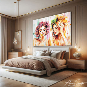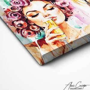 Notre tableau aquarelle abstrait illustre deux femmes qui boivent du champagne en prenant soin de leurs cheveux. Une œuvre luxueuse et féminine qui respire modernité. Parfaite pour apporter élégance et originalité à vos murs.
