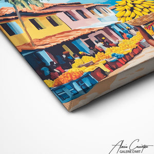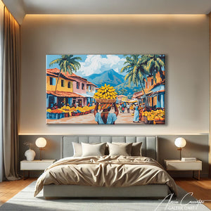 Notre tableau paysage africain représente une femme de dos portant des bananes au milieu d’un marché. Authentique et coloré, il apporte chaleur et tradition à vos murs. Idéal pour une déco vivante et inspirée.