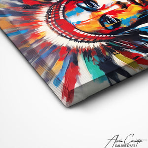 Notre tableau femme indienne coiffée de plumes colorées, dans une composition à la fois puissante et symbolique. Les détails vivants de la coiffe contrastent avec l’intensité de son regard. Parfait pour une déco ethnique, audacieuse et expressive. Ce tableau célèbre la force, la culture et la beauté sauvage.