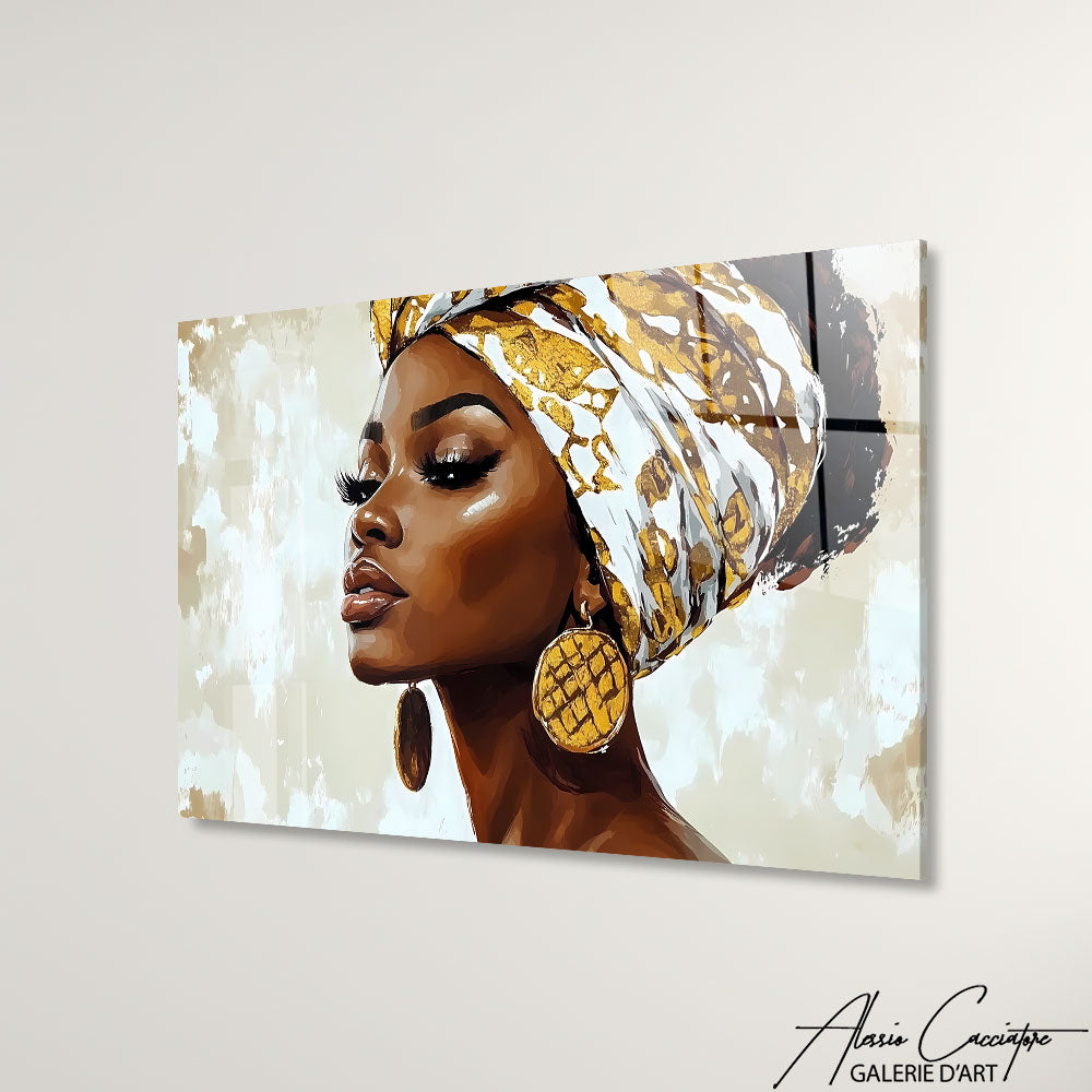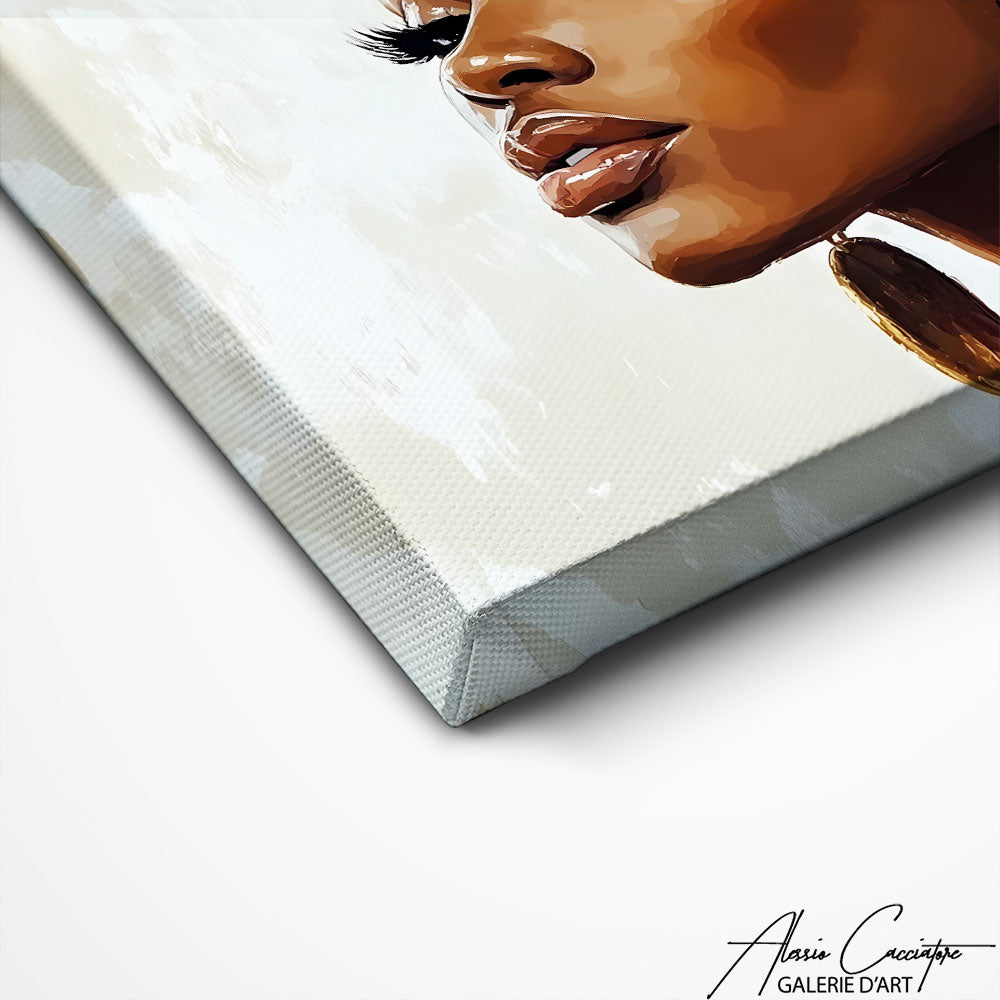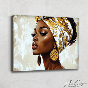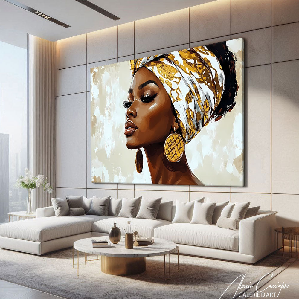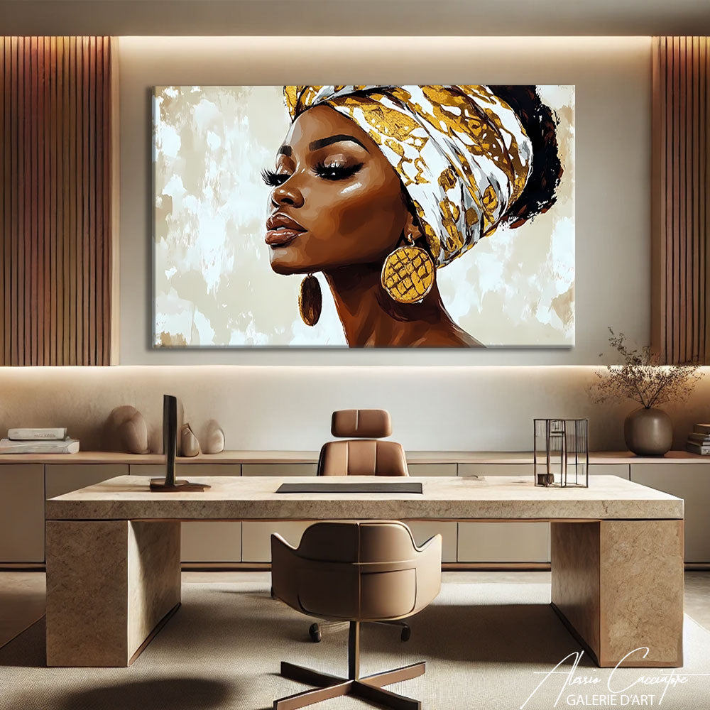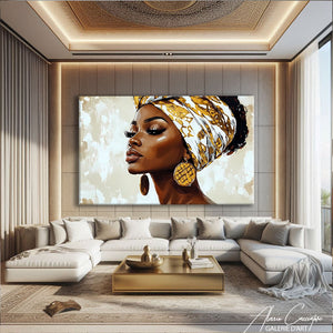 Notre tableau femme noire et or présente une femme africaine luxueuse sublimée par des détails dorés. Chic et moderne, il respire puissance et élégance. Une pièce décorative parfaite pour illuminer vos murs.