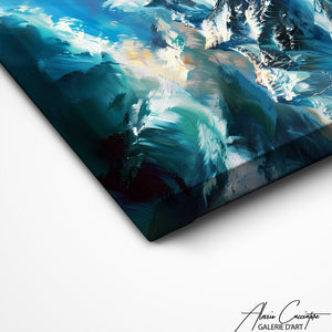 La splendeur hivernale dans ce tableau paysage de montagne est saisie dans toute sa gloire gelée. Les teintes blanches et bleues se mélangent pour évoquer le silence et la pureté de la neige, offrant une œuvre paisible et rafraîchissante