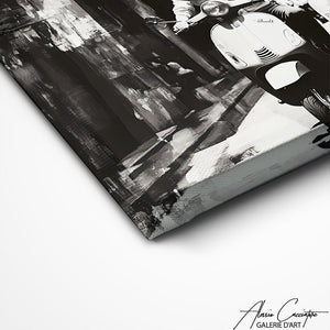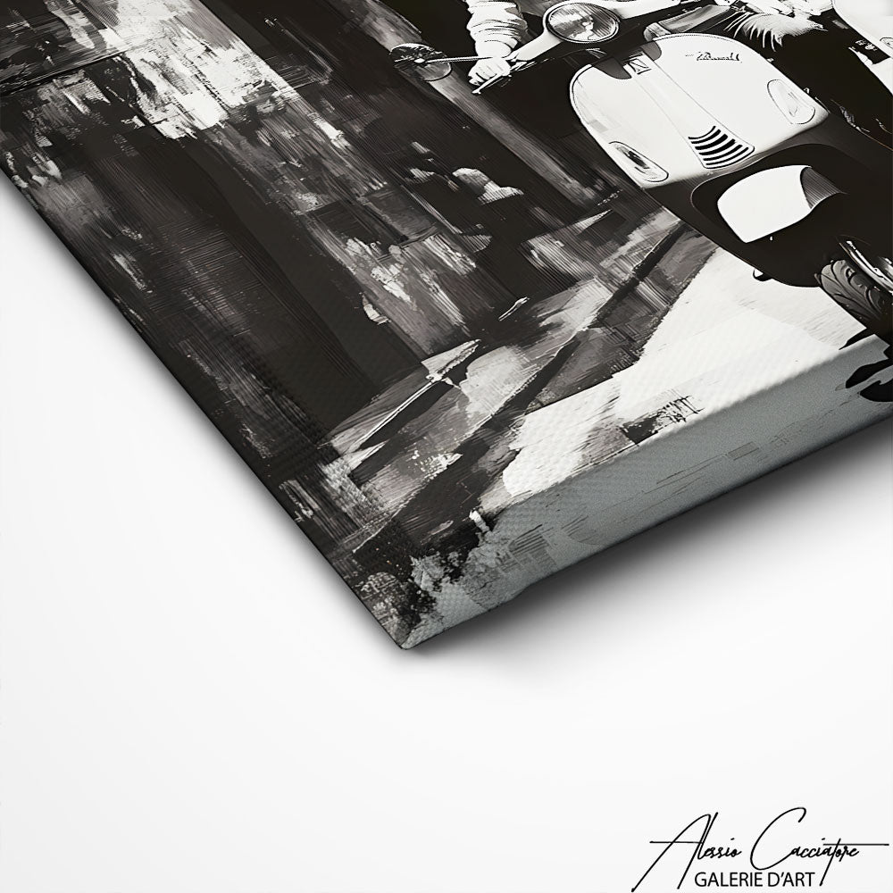 Notre tableau noir abstrait met en avant un couple sur une Vespa en noir et blanc moderne. Une œuvre chic et élégante qui allie romance et minimalisme. Parfait pour donner un cachet raffiné à vos murs.