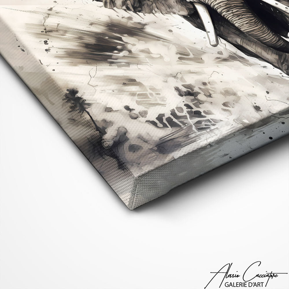 Le contraste dramatique du noir et blanc dans ce tableau met en valeur la puissance et la grâce de l'éléphant, offrant une œuvre d'art intemporelle qui captivera tous les regards.