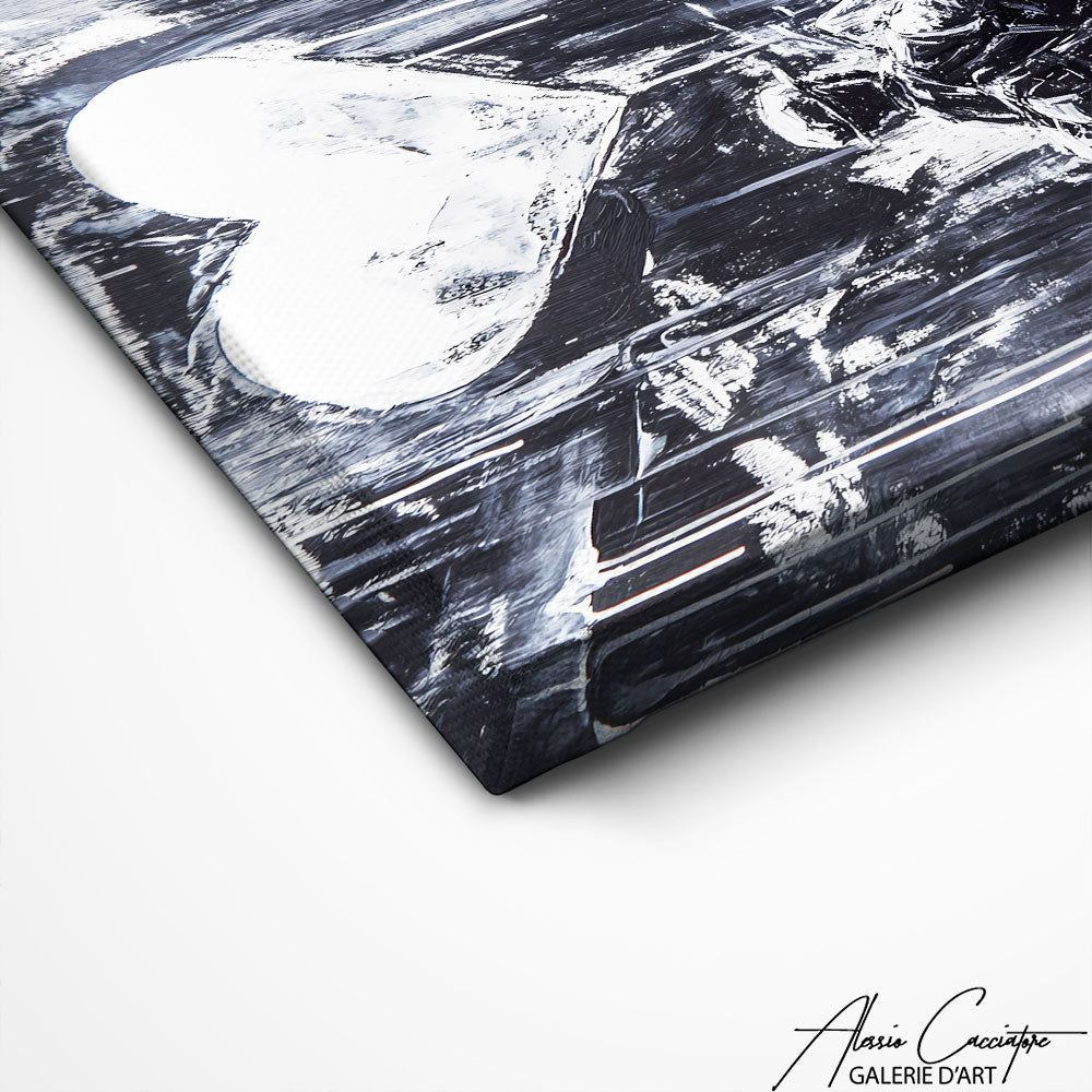 Notre tableau noir et blanc moderne capture un soldat tenant un ballon-cœur blanc. Cette œuvre conceptuelle contemporaine exprime dichotomie guerre-amour, apportant profondeur émotionnelle et réflexion artistique puissante à votre décoration avec son message humaniste saisissant.