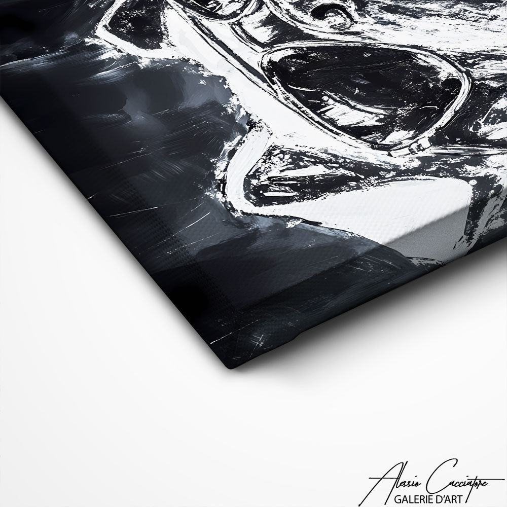 Notre tableau noir et blanc moderne craque avec ce bulldog gangster à lunettes et chaîne. Humour et attitude garantis ! Parfait pour personnaliser un loft ou surprendre dans une chambre ado avec ce style street art décalé.
