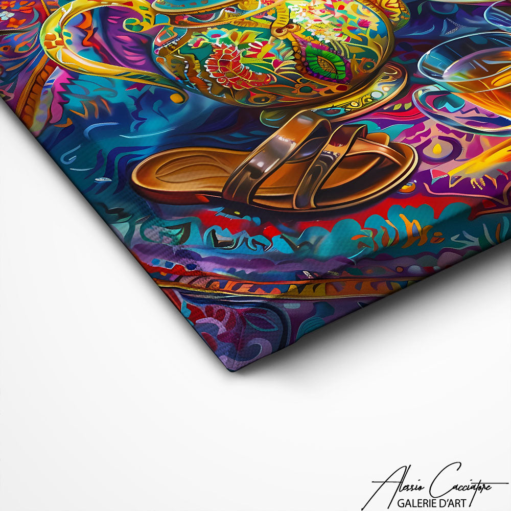 Ce tableau mural orientale transforme votre espace en un sanctuaire de beauté et de tradition. Les motifs élaborés et les couleurs vivantes apportent une touche d'exotisme et d'élégance, parfaite pour ceux qui souhaitent une ambiance chaleureuse et immersive.