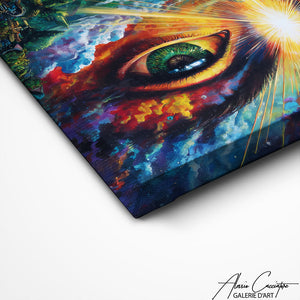 Notre tableau paysage illustre un regard surréaliste qui domine un décor vert de montagnes et de lacs. Poétique et mystérieux, il attire le regard et éveille l’imaginaire. Idéal pour une décoration originale et moderne.