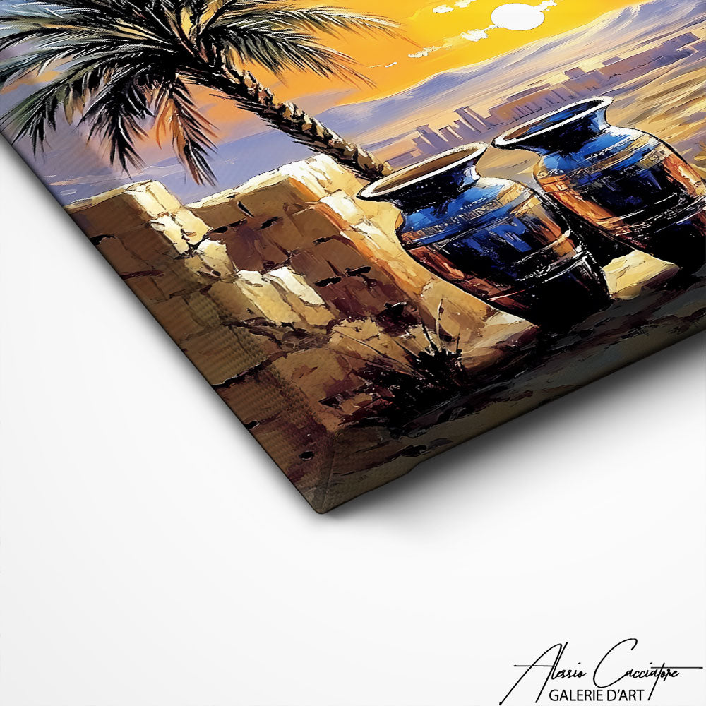 Entre ciel et terre, notre tableau capture la beauté naturelle d’un coucher de soleil sur les collines. Les teintes dorées et ambrées se marient à la végétation, créant une harmonie apaisante. Parfait pour agrémenter un salon ou une entrée, il apporte une note chaleureuse et raffinée à votre espace.