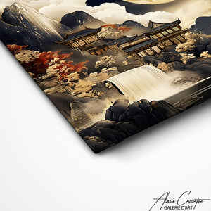Une lune lumineuse domine un paysage montagneux composé de cascades et de formations rocheuses. Des constructions traditionnelles sont dispersées le long de l’eau, créant un équilibre visuel. Les contrastes entre lumière, ombres et reflets renforcent la profondeur de la scène. L’ensemble offre une vision paisible et immersive.