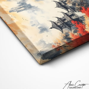 Paysage asiatique brumeux avec des temples perchés dans les montagnes et un chemin sinueux au premier plan. Deux silhouettes avancent calmement dans un décor automnal aux tons rouges et orangés. La profondeur est accentuée par les nuages et les reliefs superposés. Un visuel apaisant qui invite à la contemplation.