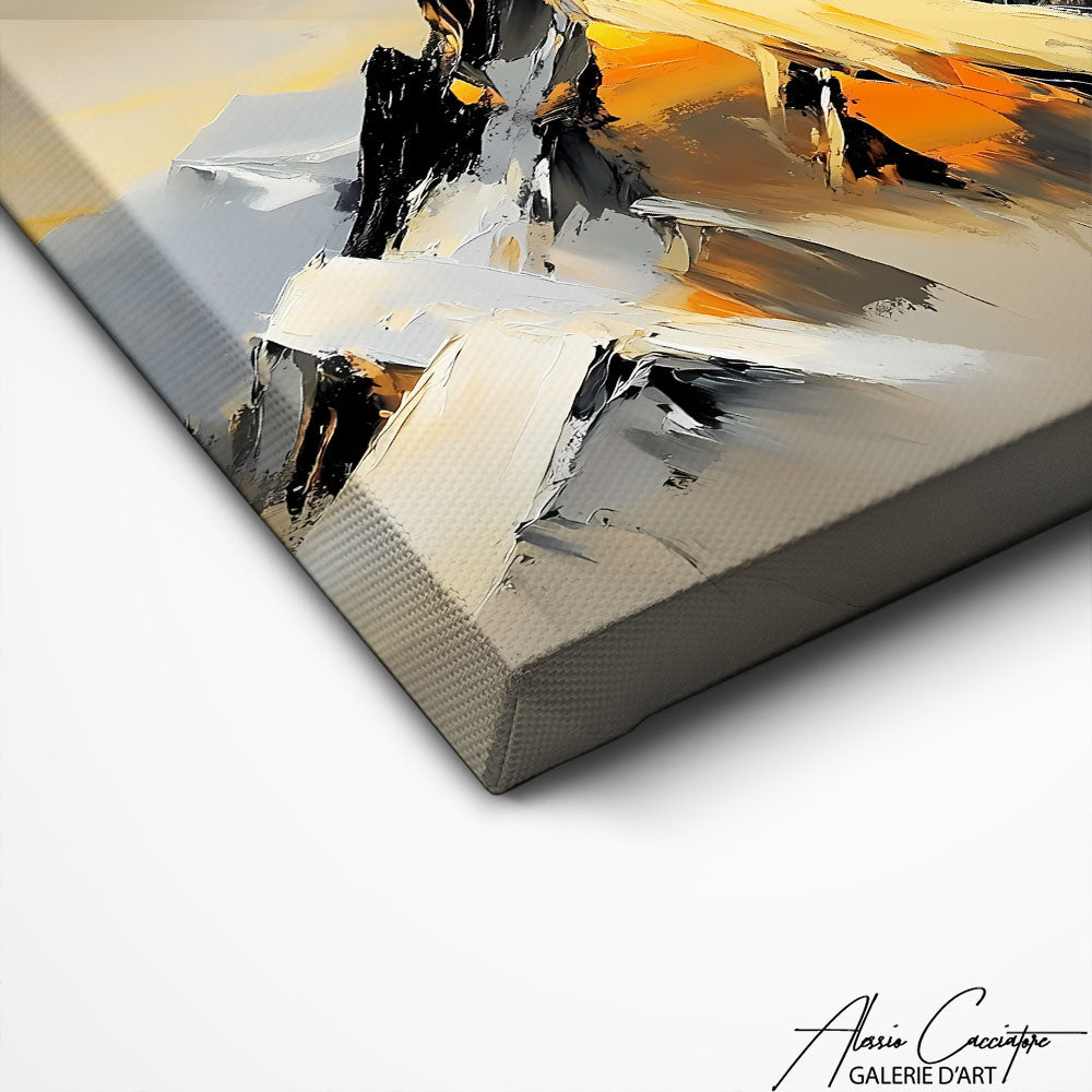 Notre tableau doré contemporain montagne représente des sommets lumineux baignés d’une douce lumière dorée. L’alliance subtile du gris, de l’orange et de l’or crée une profondeur captivante, symbole d’élévation et de grandeur. Parfait pour un intérieur moderne, il évoque la puissance tranquille de la nature.