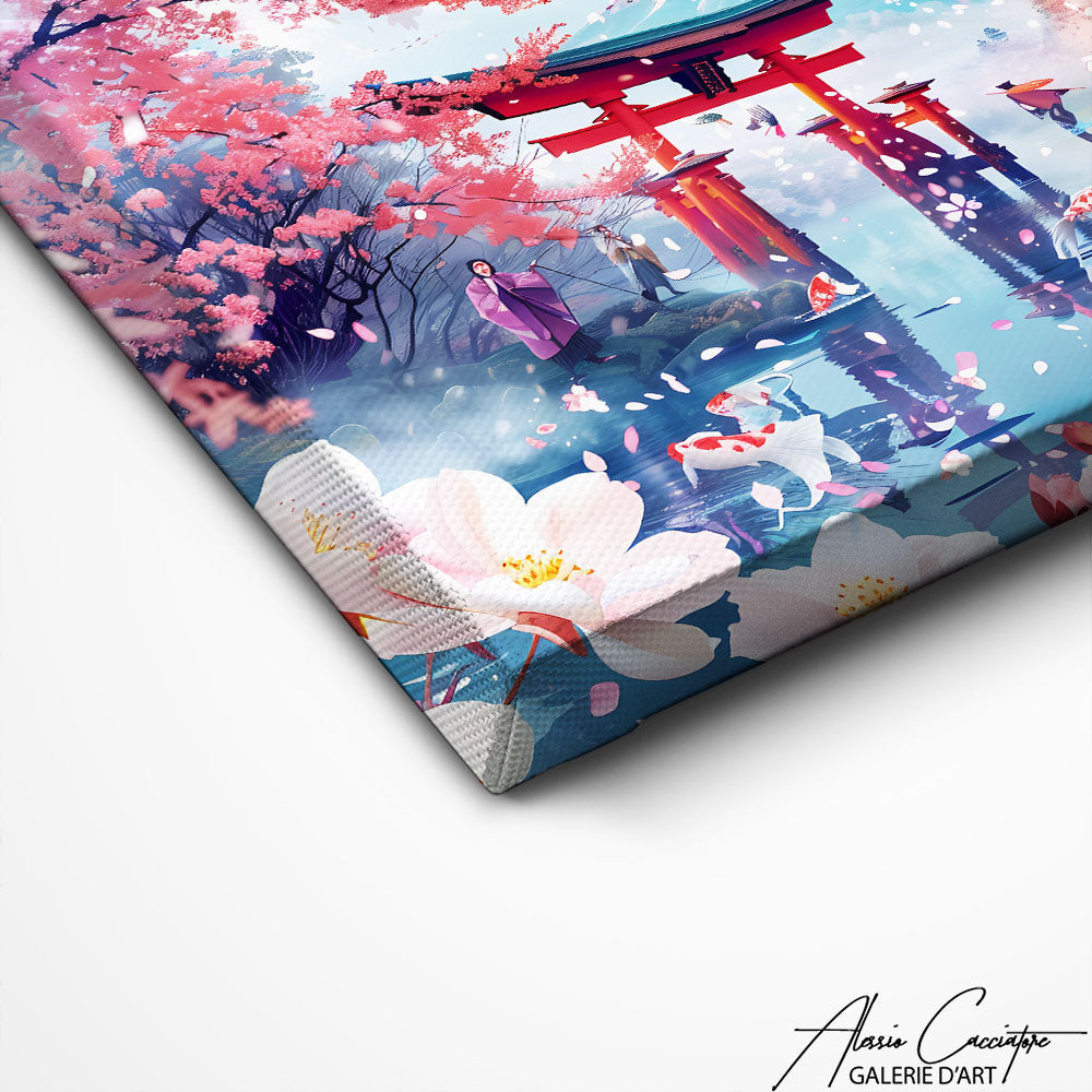 Notre tableau paysage japonais réunit les symboles emblématiques du Japon dans une scène paisible : le Mont Fuji en arrière-plan, un temple traditionnel au cœur du paysage et un cerisier en pleine floraison. L’harmonie des éléments inspire calme et beauté. Parfait pour une déco zen et raffinée. Ce tableau évoque l’équilibre entre nature et spiritualité japonaise.