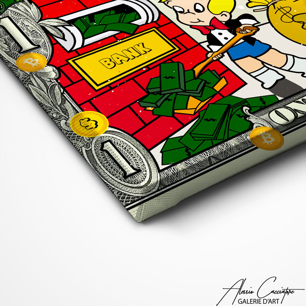 En partant d'un billet de monnaie américaine, l'artiste a décidé de le moderniser pour ajouter ces personnages de cartoon préférés pour concevoir ce tableau picsou dollar