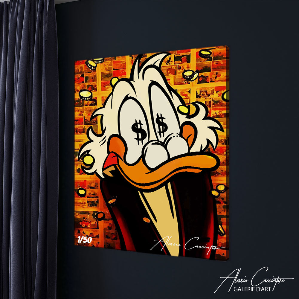Notre tableau Scrooge fascine par son symbolisme puissant avec ces dollars hypnotiques dans le regard. Cette œuvre audacieuse dynamisera un bureau ou un salon contemporain en apportant une touche d'ironie sophistiquée. Le personnage emblématique interpelle et stimule les conversations. Parfait pour les entrepreneurs et collectionneurs d'art conceptuel cherchant une décoration à fort impact visuel.