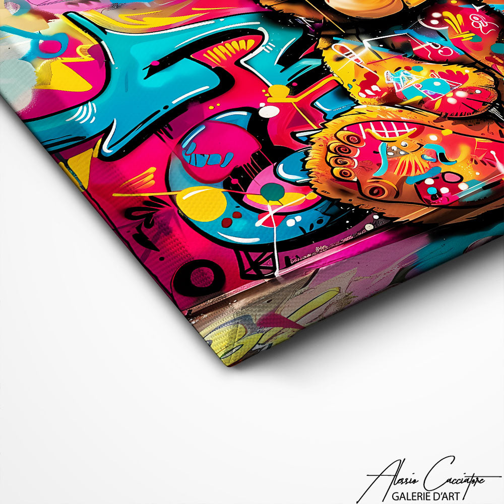 Dynamique et audacieux, notre tableau street art capture l'essence de l'expression urbaine. Ce tableau est une fenêtre ouverte sur l'art contemporain, idéal pour les espaces modernes cherchant à ajouter un élément de jeunesse et d'énergie.