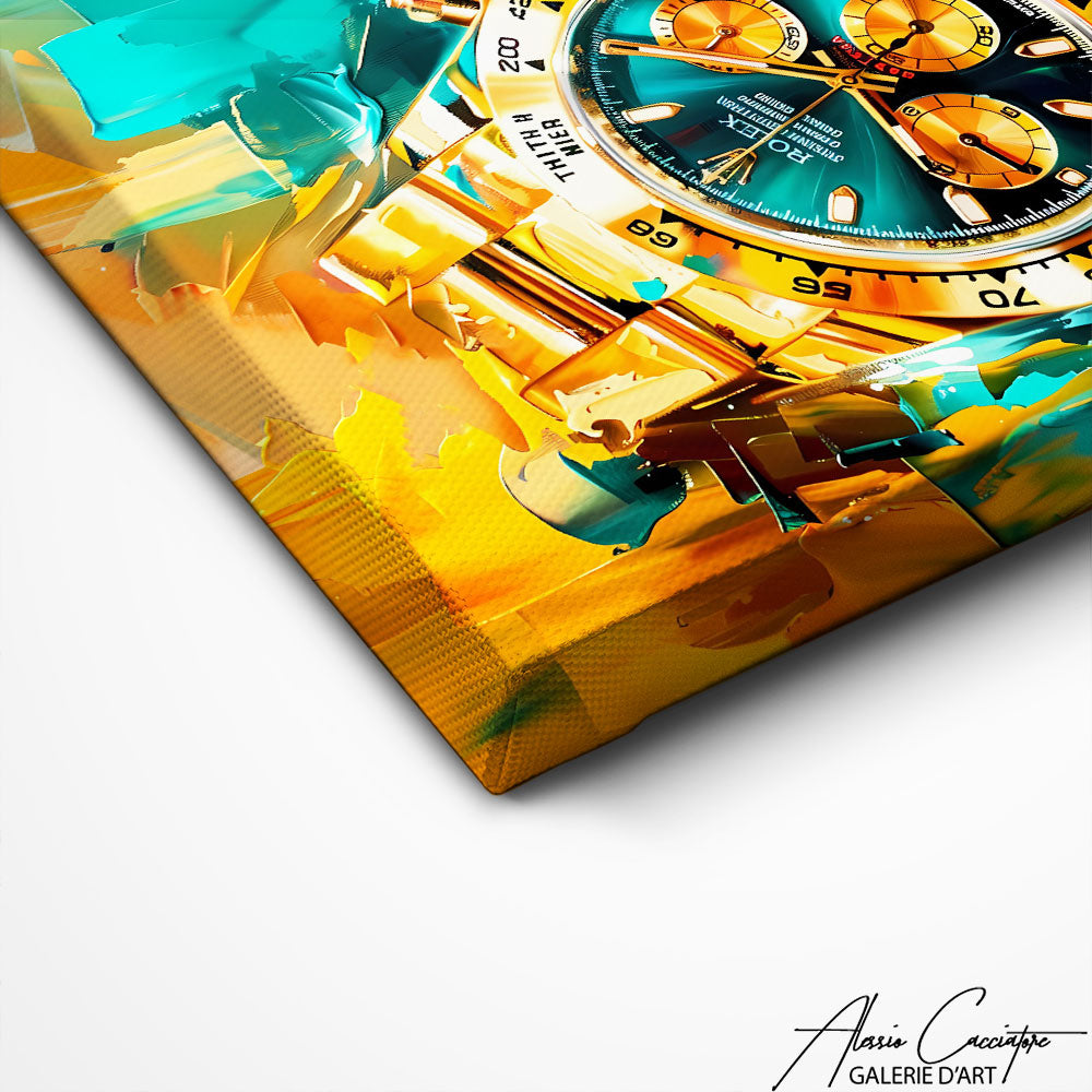 Ce tableau Rolex Daytona met en avant cette celèbre montre de course, avec des détails raffinés et des couleurs élégantes. Parfait pour apporter une touche sportive et prestigieuse à votre intérieur.