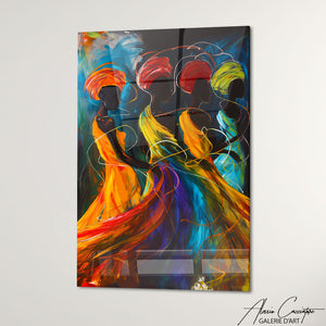 Ce tableau utilise le contraste puissant du noir pour illustrer des scènes et des symboles africains, offrant une perspective moderne et élégante sur l'art africain. Un choix audacieux pour un décor contemporain qui embrasse la richesse culturelle