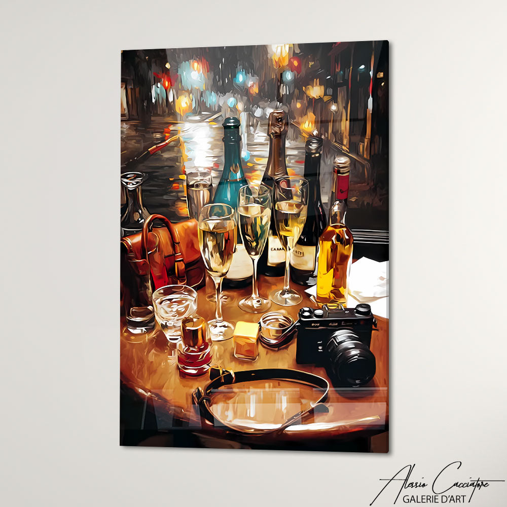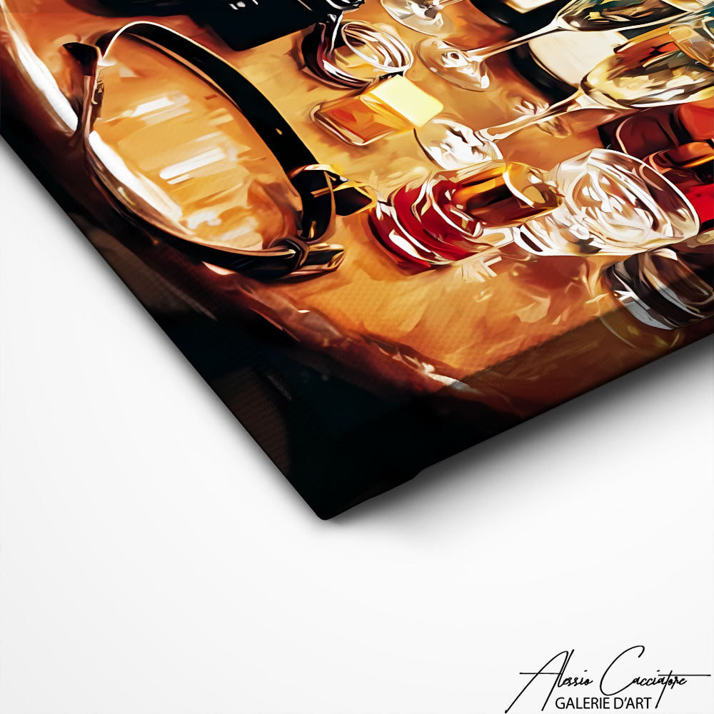 Notre tableau chic cuisine illustre une table remplie de verres et de bouteilles de champagne dans un style abstrait coloré. Festif et luxueux, il respire élégance et convivialité. Parfait pour une salle à manger raffinée.