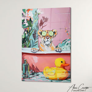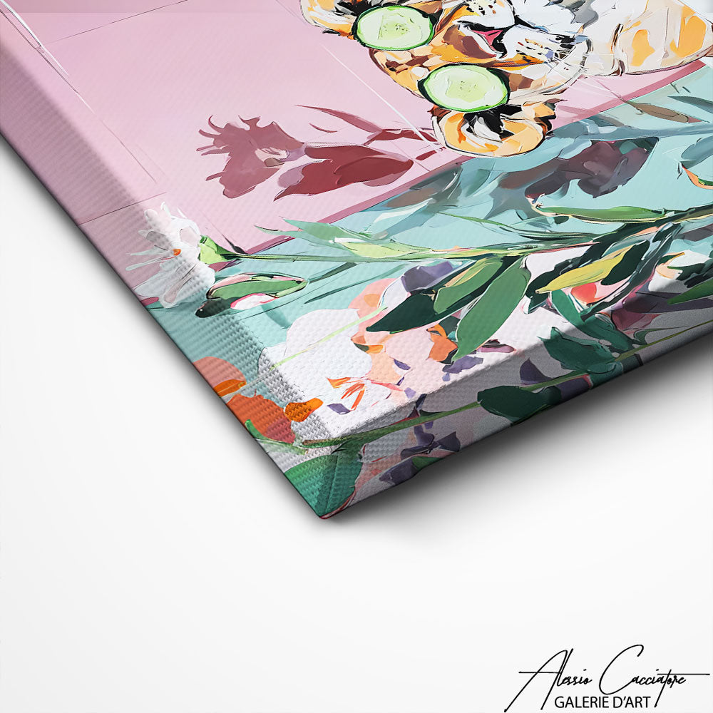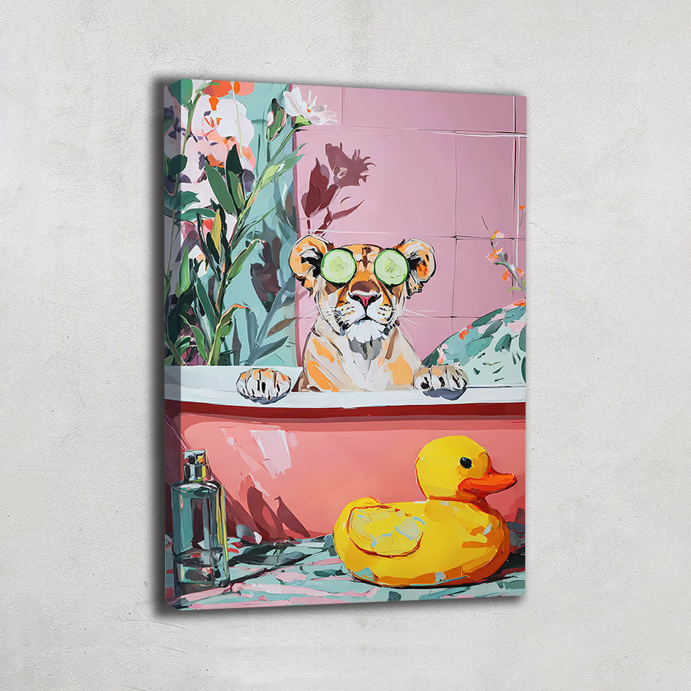 Ce tableau salle de bain lion illustre un lion profitant d’un moment spa avec masque et concombre, entourée de teintes pastel. Idéal pour insuffler douceur et fantaisie à votre intérieur.