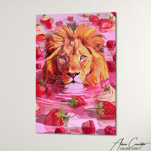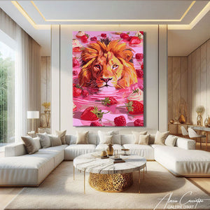 Notre tableau salle de bain met en avant une tête de lion baignant dans un univers de roses et de fraises. Surréaliste et expressif, il attire le regard et apporte une note unique et luxueuse à votre décoration.