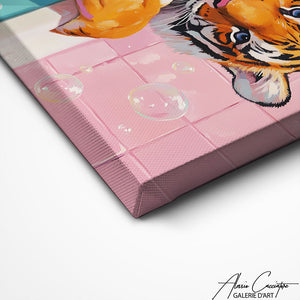 Notre tableau plein d’humour et de style représente un tigre majestueux en train de prendre son bain, dans une scène décalée et inattendue. Le contraste entre la puissance de l’animal et la douceur du moment crée un effet visuel original et amusant. Parfait pour une salle de bain moderne, chic ou insolite. Ce tableau apporte une touche de fantaisie et de caractère à votre espace bien-être.