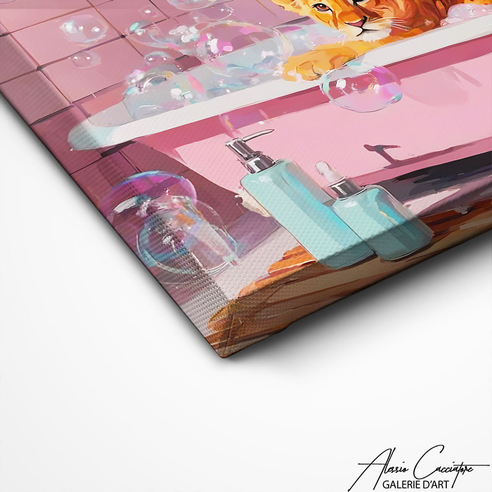 Notre tableau décoratif pour salle de bain représente un lionceau adorable profitant d’un bain moussant dans une baignoire rose. Doux, amusant et coloré, il apporte une note de tendresse et de bonne humeur à votre décoration intérieure.