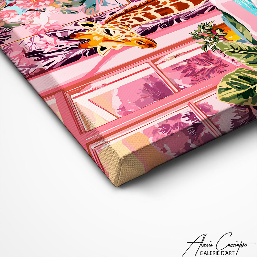 Ce tableau girafe salle de bain montre une girafe relaxant dans une baignoire rose, dans une ambiance tropicale et lumineuse. Une œuvre moderne et décalée, parfaite pour un style unique.