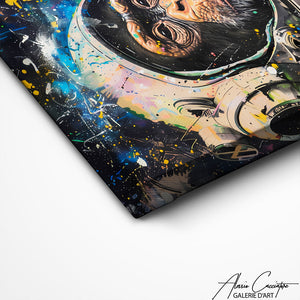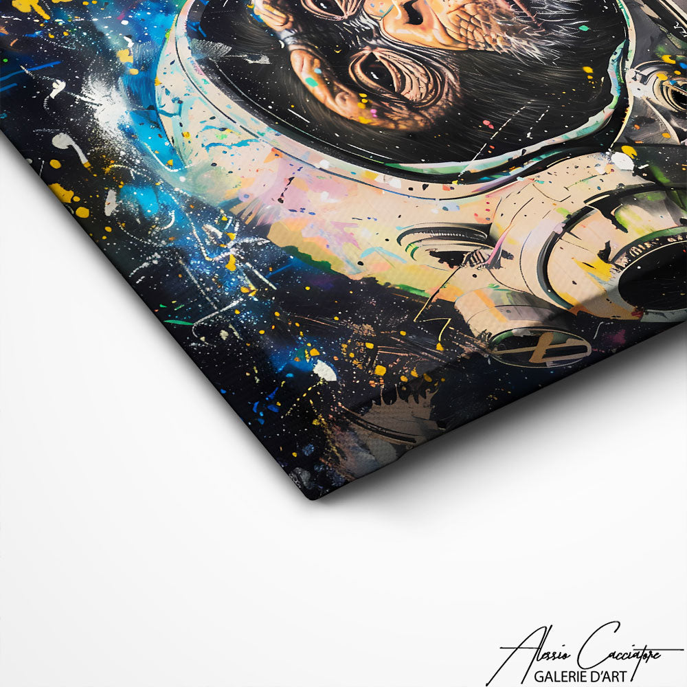 Ce tableau présente un singe dans une composition étonnante, mélangeant l'art contemporain et des éléments surprenants pour offrir une œuvre qui défie les attentes et enchante le spectateur.