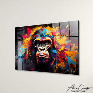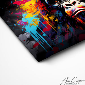 Ce tableau gorille réalisé dans un style typique du street art. Avec son regard perçant et sa présence imposante, il donne une impression de force et de détermination, faisant de ce tableau une œuvre puissante et captivante